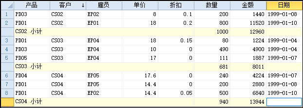 g As New SubtotalGroup '定义一个新的分组可以统计得出每个客户的采购数量和金额,如下图: