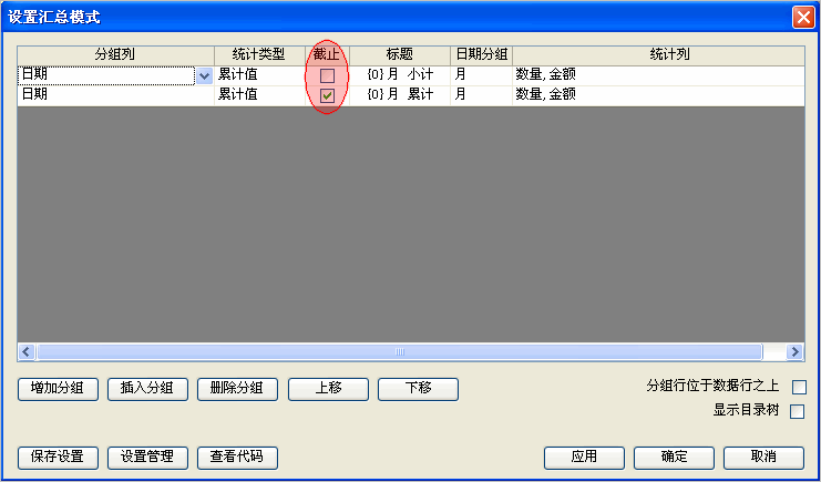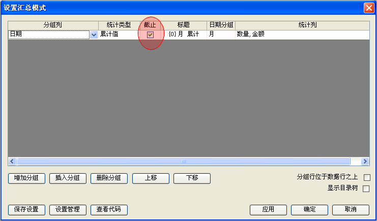 提示:如果选择选项“分组行位于数据行之上”,则 截止统计无效。