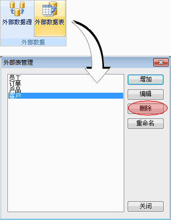 在菜单的“数据表”功能区,单击“外部数据表”按钮,打开“外部表管理”窗口,我们可以在这个窗口删除外部表: