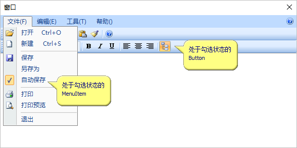 MenuItem和Buton类型的菜单项目,都有一个勾选(Checked)属性,它们都可以作为状态按钮使用:
