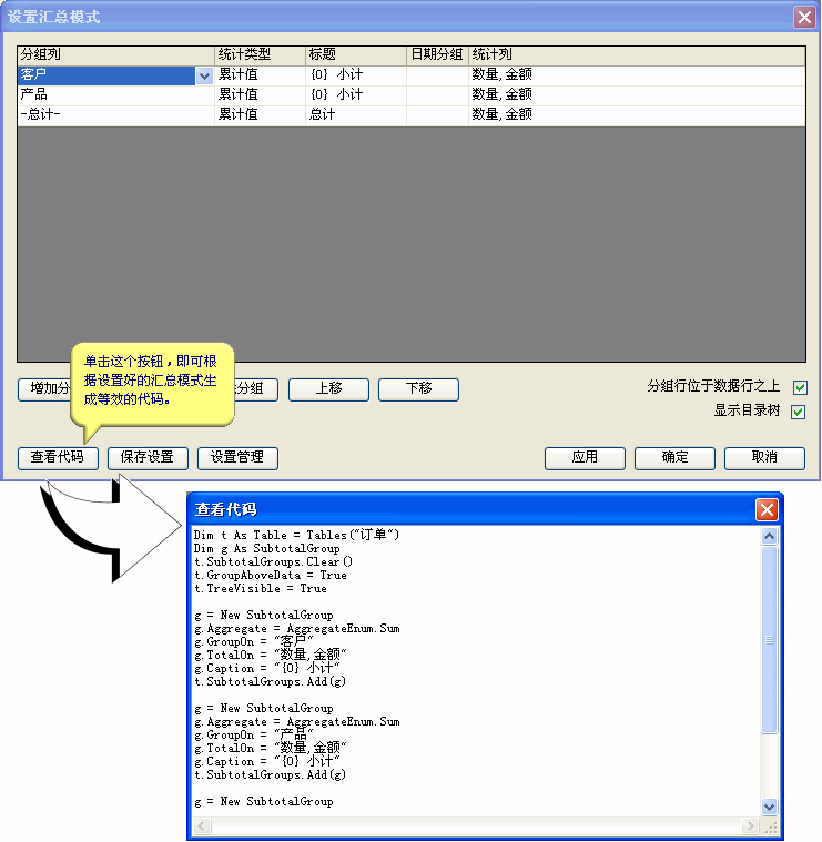 我们很少需要自行编写生成汇总模式的代码,通常是在汇总模式设置窗口中,先设置好汇总模式,然后单击按钮"查看代码",即可根据现有设置生成等效的代码: