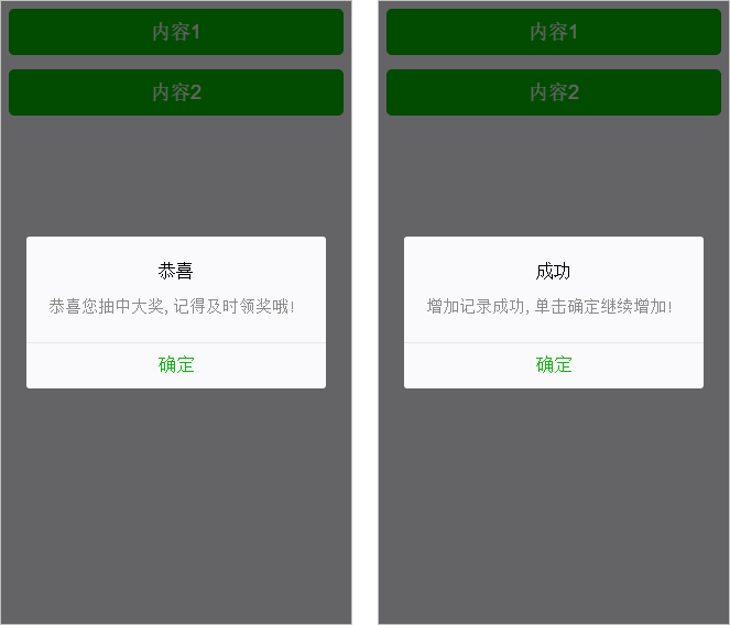 下图是通过手机访问的效果,我们只定义了一个对话框,分别单击两个按钮,会在这个对话框显示不同的内容: