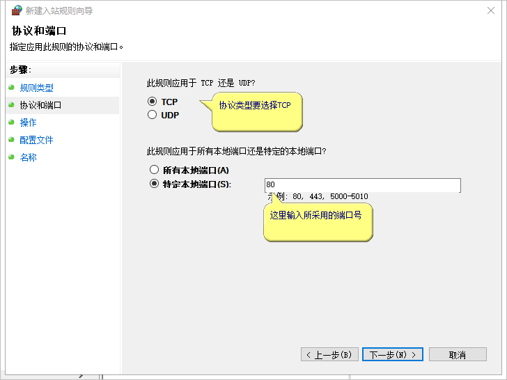 5、协议类型选择TCP,并输入你的http服务所采用的端口号: