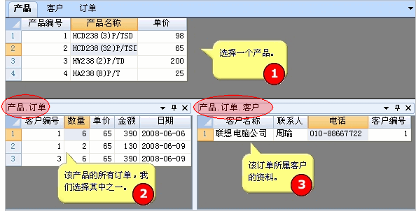 3、在产品表中选择一个产品,即可用关联表的形式列出该产品所有的订单,而在该关联表中选择一个订单,会用另一个关联表列出该订单所属客户的资料。