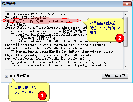 例如通过下图的错误提示,我们可以知道错误代码位于订单表的DataColChanged事件: