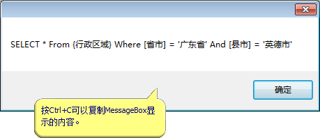 这在动态合成一些复杂的SQL语句或表达式时的时候很实用,例如我们可以从MessageBox中复制合成好的SQL语句,粘贴到SQL执行窗口进行执行调试,找出此SQL语句的问题后,再回头调整代码。