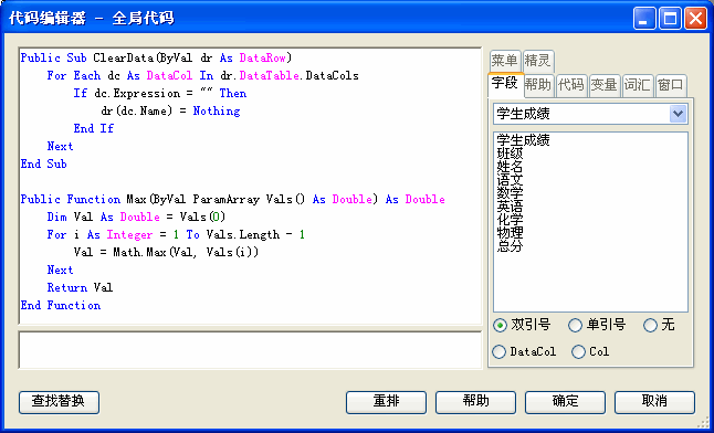 如果你系统学习过Visual Basic.net,可以在全局代码中直接用Visual Basic的语法规则定义Sub或者Function过程。