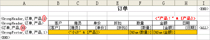 希望根据产品分组打印订单,并统计每个产品的销售数量和金额,并自动换页,模板可按下图所示设计: