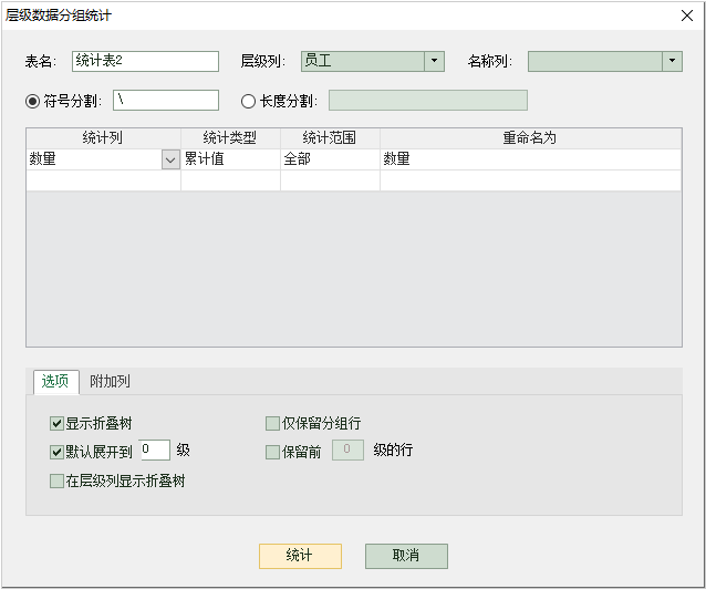按下图所示设置层级分组统计,选择好层级列,名称列留空,分割模式选择符号分割,输入分割符号"\":
