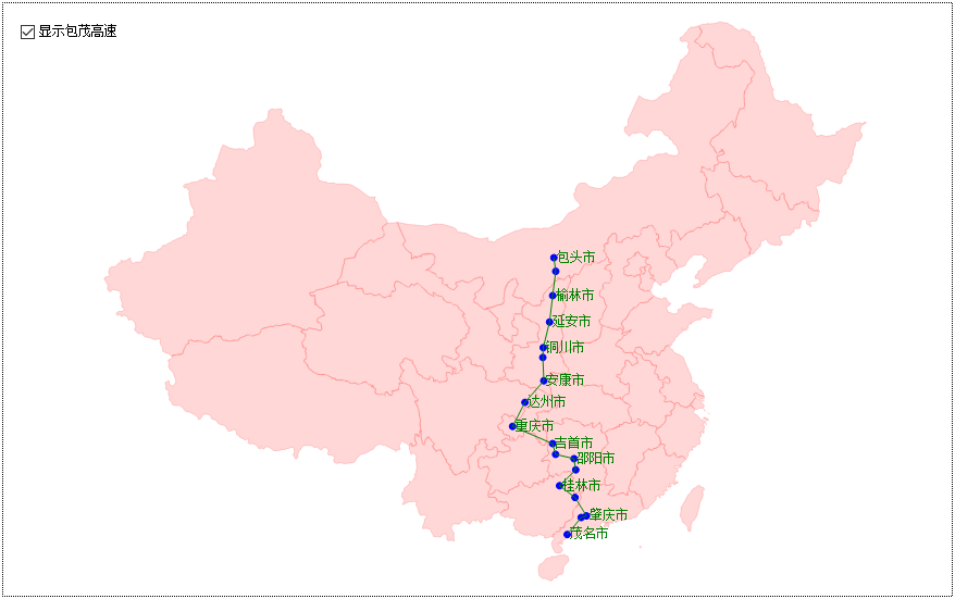 本示例的任务是在中国地图上绘制出包茂高速公路经过的各城市: