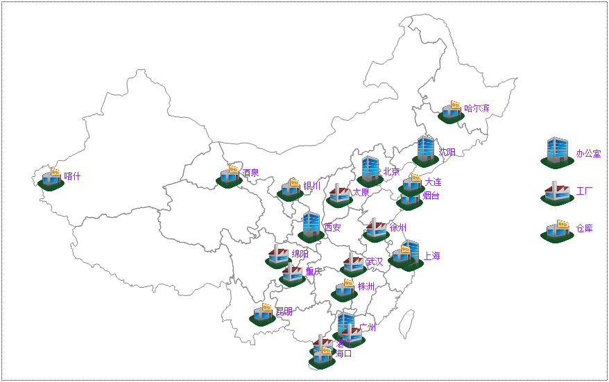 本节的任务是在地图上用图片标记出某企业的办公室、工厂和仓库所在地: