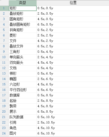 首先用一个表指定了所有形状的位置,这里所有形状的大小一致,所以只需指定位置即可: