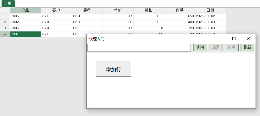 这个示例很简单,就是在网页中单击"增加行"按钮,直接在Foxtable的订单表中增加一行: